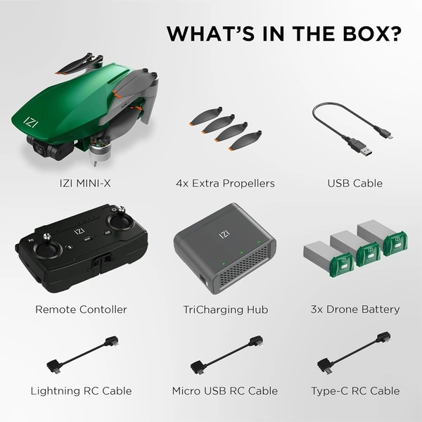 - Box Contents - Mini X drone, Remote controller , 3x battery, Propellers 4pcs, 3 way charging hub with adapter and Type C cable ,Carry case , RC cables 3x , User manual.
